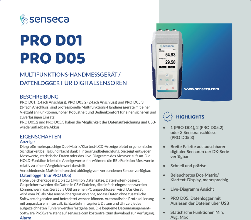 PRO D01 (1-Kanal) und PRO D05.2 (2-Kanal) von Senseca sind hochwertige multifunktionale Handmessgeräte für Digitalsensoren. Mit vorkalibrierten Sensoren kombiniert, ermöglichen sie hochpräzise Referenzmessungen (zum Beispiel Temperatur und Luftfeuchte mit 100stel Auflösung, Druck, Luftqualität, Photoradiometrie/Lichtmessung und Bodenfeuchte). Das sehr weite Temperaturmessspektrum reicht von -196 bis 500 °C. Einzigartig für diese Geräteklasse ist die Kalibrierbarkeit mit CvD-Koeffizienten. Besonders komfortabel ist das große, hintergrundbeleuchtete Mehrsprachen-Display für Messwerte, statistische Daten und Live-Diagramm. Der Multi-Datenlogger PRO D05.2 mit Datenprotokoll-Funktionen (Intervalle 1 Sek. bis 1 Std.) zeich‑