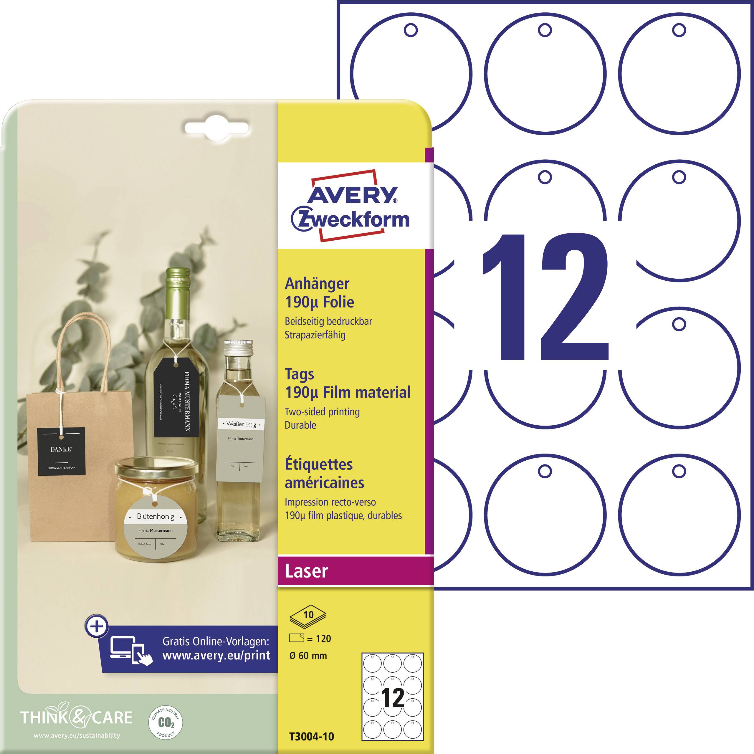 Avery-Zweckform T3004-10 Anhänger-Etiketten Ø 60 mm Polyester Weiß 120 St. Nicht klebend Farblaserdrucker, Laserdrucker