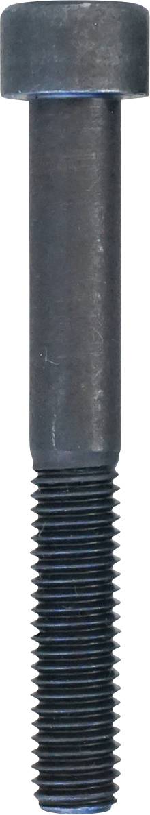 Un gros plan d'un seul boulon en métal noir avec une tête cylindrique et une tige filetée, présenté verticalement sur un fond blanc uni.