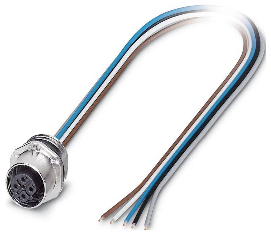 Un connecteur métallique cylindrique avec cinq fils exposés, chacun d'une couleur différente : bleu, blanc, noir, brun et gris, qui en émanent.