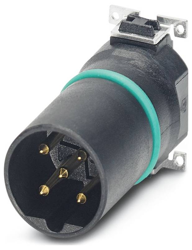 Gros plan d'un connecteur audio noir à cinq broches, présentant une forme circulaire avec un anneau vert et un support de montage sur sa face supérieure.