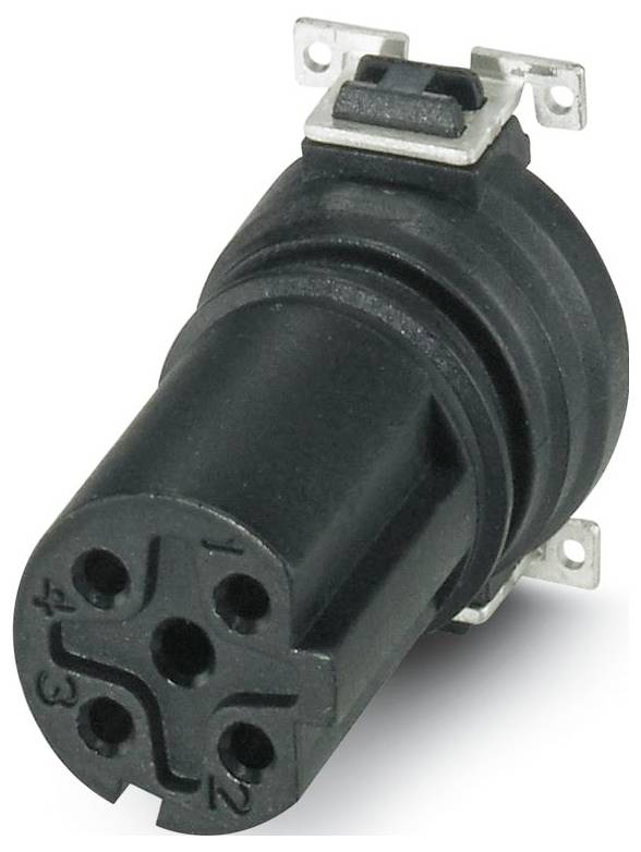 Un connecteur électrique noir avec quatre ports circulaires, conçu pour insérer des broches. Deux crochets métalliques sont montés sur les côtés.