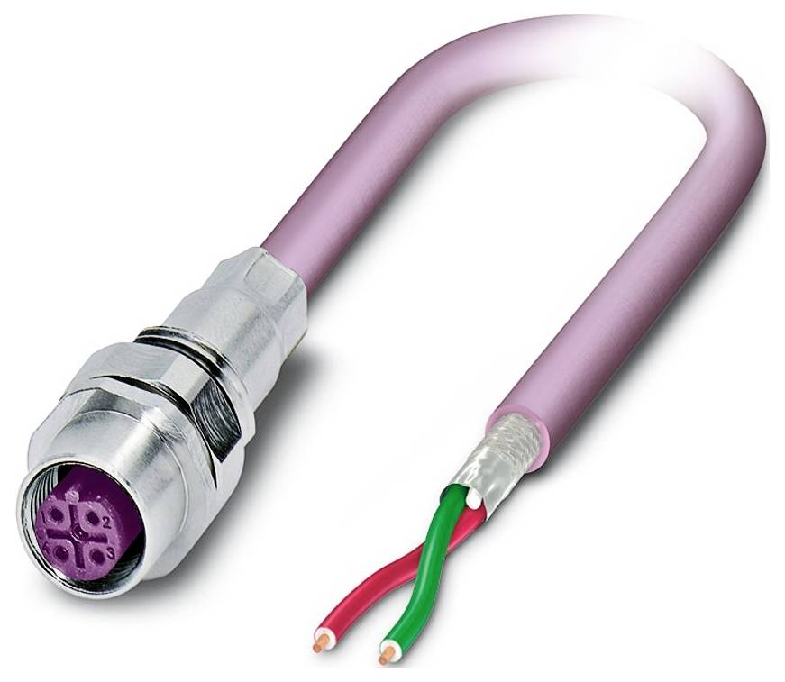 Un câble coaxial rose avec un connecteur métallique à une extrémité ; des fils rouge et vert exposés à l'autre extrémité.