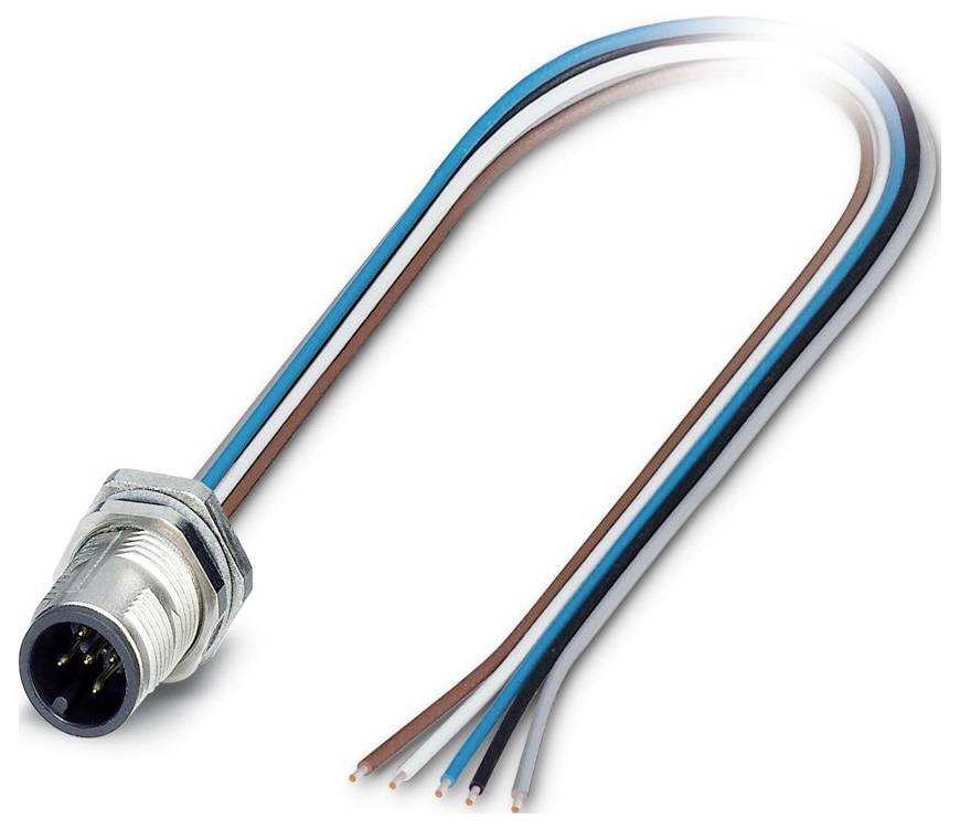 Un assemblage à quatre fils avec un connecteur métallique à une extrémité et des fils nus à l'autre extrémité, comportant des brins marron, bleu et blanc.