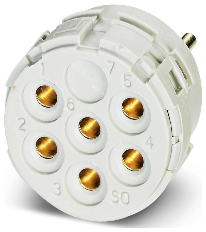 Une image rapprochée d'un connecteur électrique à sept broches montrant des emplacements circulaires numérotés pour l'insertion des broches, utilisé dans les appareils électroniques.