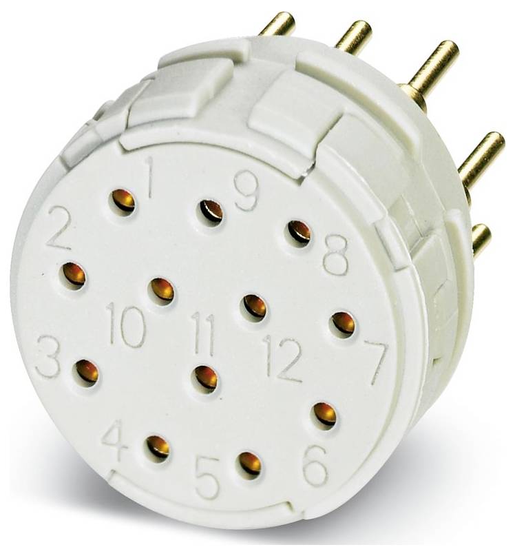 Un connecteur électrique circulaire blanc avec des broches métalliques numérotées, disposées en cercle.
