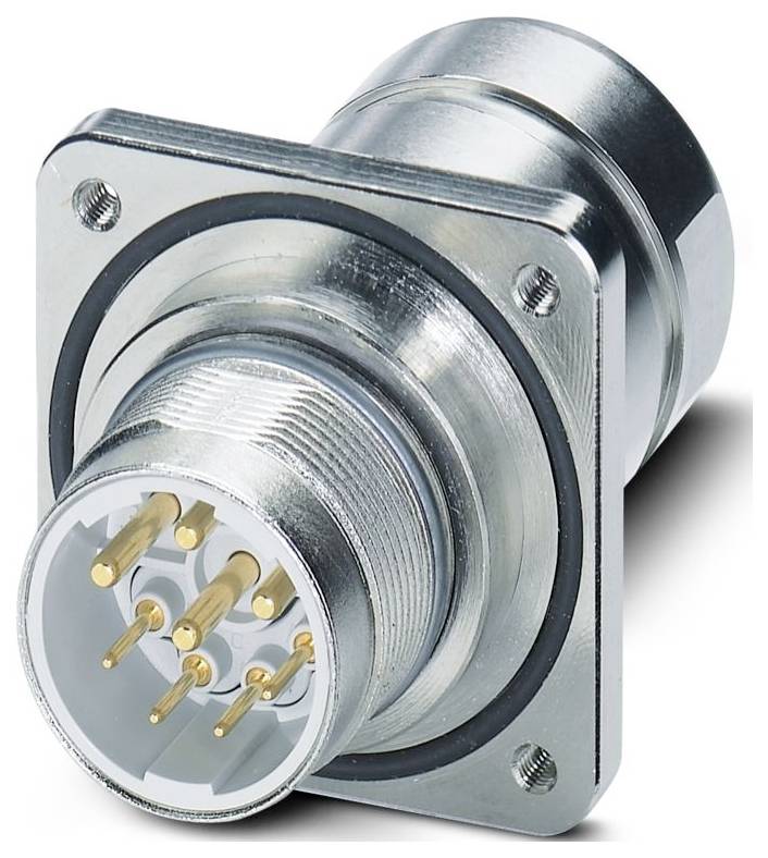 Un connecteur électrique en argent de forme cylindrique, présentant plusieurs broches dorées disposées selon un motif circulaire à l'avant.