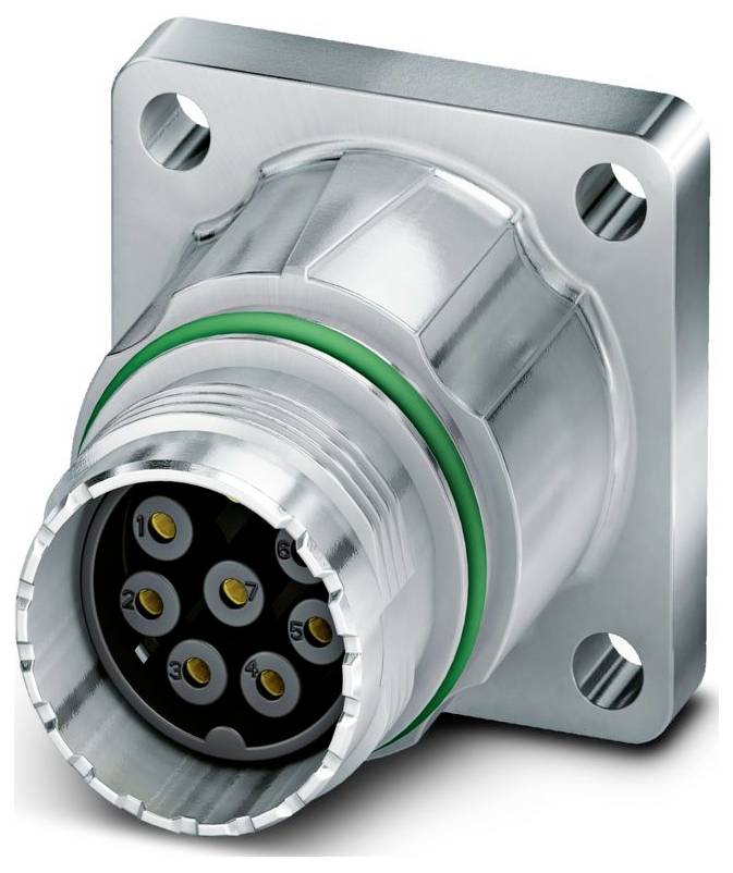 Un connecteur circulaire métallique avec plusieurs broches et un montage à bride, doté d'une bague d'étanchéité verte, généralement utilisé pour des applications industrielles.