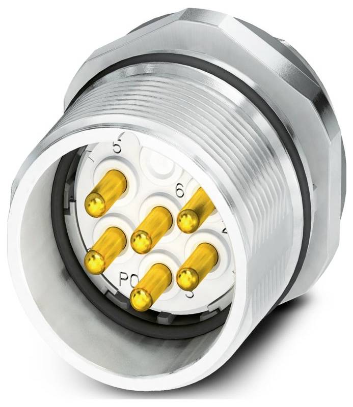 Un connecteur circulaire métallique avec six broches dorées à l'intérieur, utilisé pour les connexions électriques.