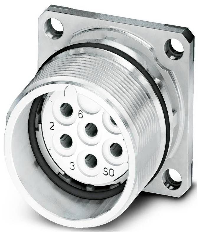 Un connecteur métallique circulaire avec huit trous sur une base carrée, étiqueté avec des numéros et un marquage « S », probablement destiné aux connexions électriques ou de données.