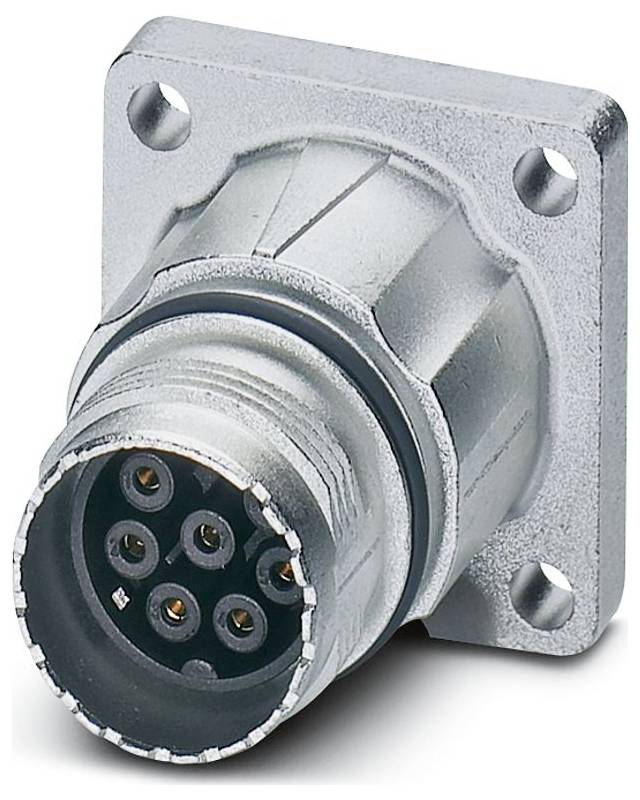 Un connecteur circulaire métallique avec sept broches et une plaque de montage carrée, utilisé pour les connexions électriques.