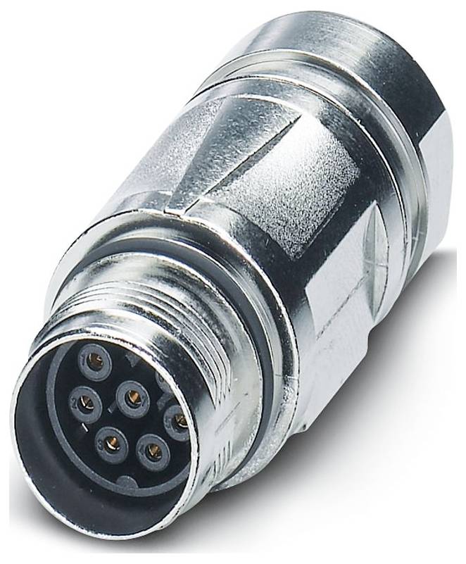 Un connecteur industriel métallique avec six broches circulaires à l'intérieur d'un boîtier cylindrique, conçu pour des connexions électriques sécurisées.