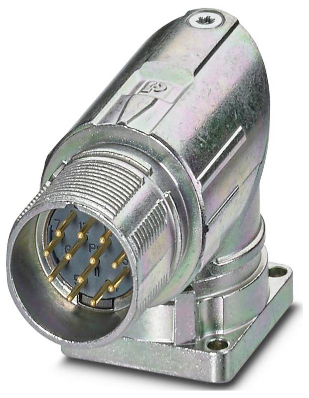Un connecteur industriel métallique avec plusieurs broches dorées, étiqueté avec des numéros, conçu pour des connexions électriques robustes.