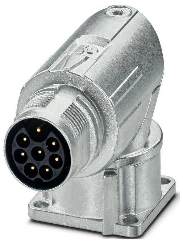 Un connecteur industriel métallique avec un corps cylindrique et plusieurs trous de broche, utilisé pour les connexions électriques robustes dans les machines.