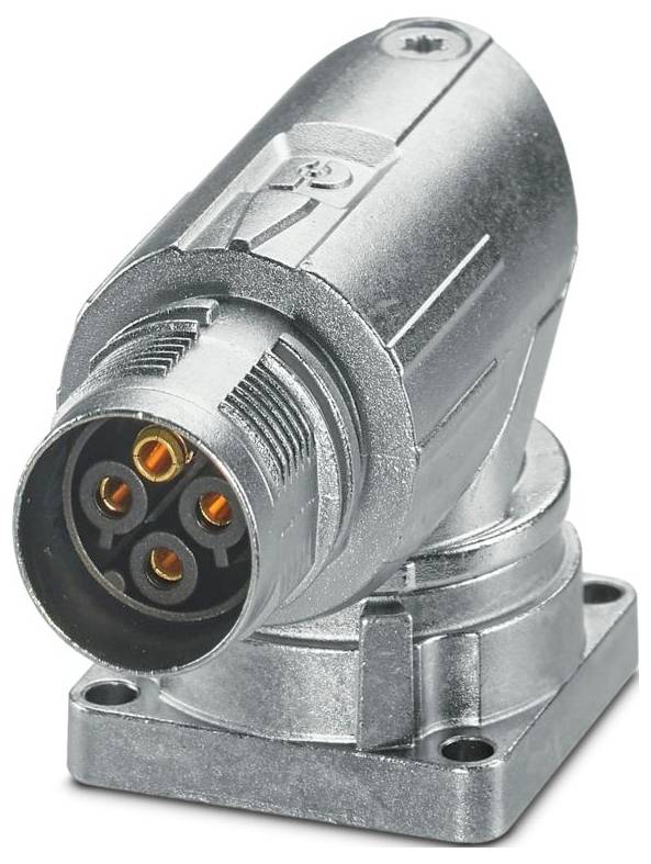Un connecteur industriel métallique, incliné, avec plusieurs emplacements de broches, conçu pour des connexions électriques robustes dans les machines lourdes ou l'équipement.