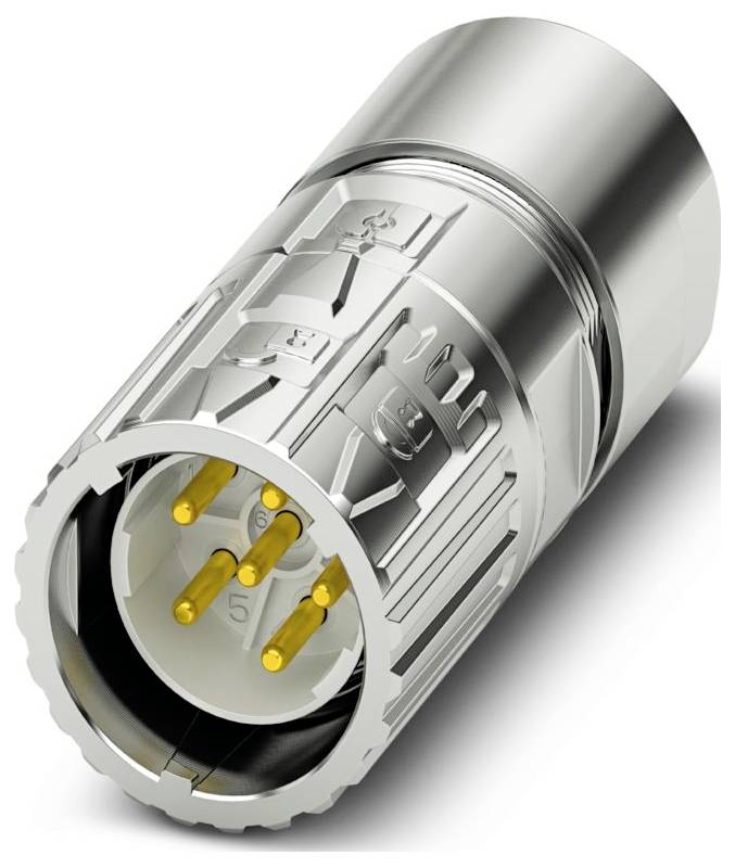 Un connecteur cylindrique métallique avec plusieurs broches en or et des détails techniques, utilisé pour les connexions électriques dans les appareils ou les machines.