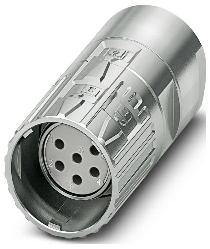 Un connecteur industriel en métal avec six broches visibles, encastré dans un boîtier cylindrique. Convient aux connexions électriques pour applications exigeantes.