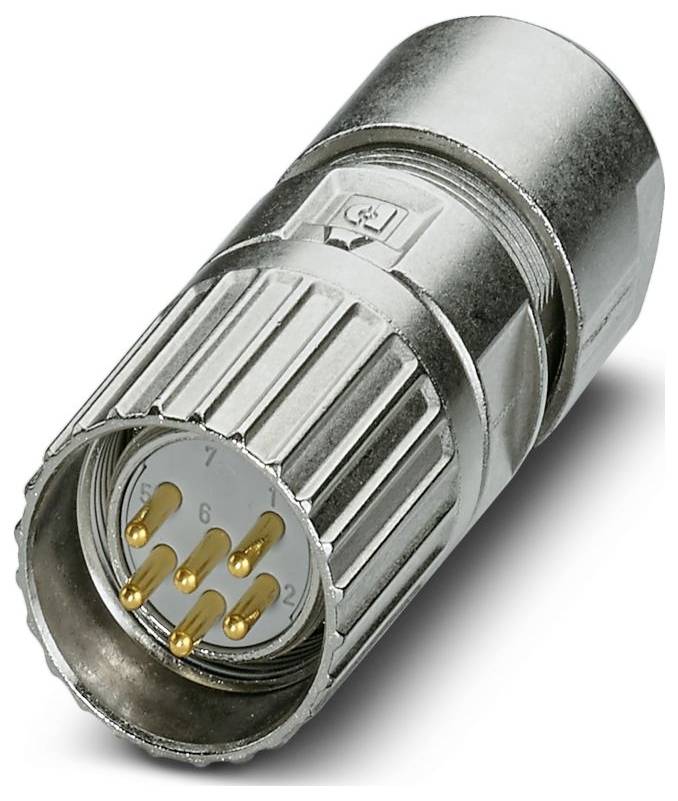 Un connecteur électrique métallique doté de plusieurs broches dorées, conçu pour assurer des connexions de câbles sécurisées dans les équipements électroniques ou les machines.