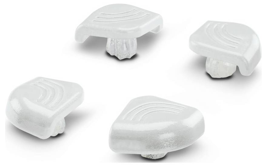 Quatre patins de meuble transparents en forme de larme, dotés d'une surface inférieure texturée et d'un sommet courbe, conçus pour protéger les planchers et réduire la friction.