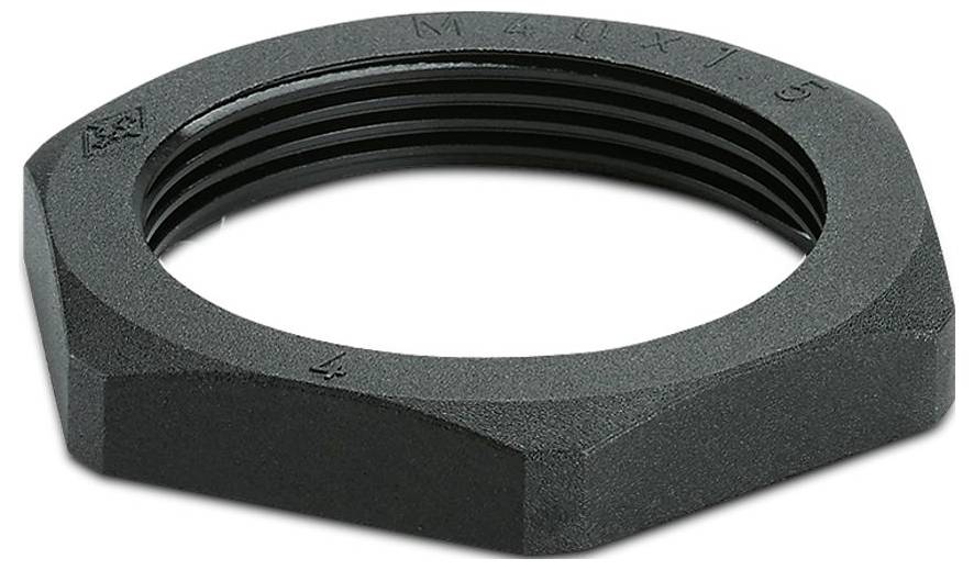 Un écrou de sécurité hexagonal noir avec filetage interne, utilisé pour fixer des composants dans des assemblages mécaniques. Marqué avec 'M40x1.5'.