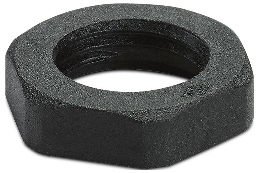« Un écrou hexagonal en métal noir avec un intérieur fileté, typiquement utilisé pour fixer des boulons dans les assemblages mécaniques. »